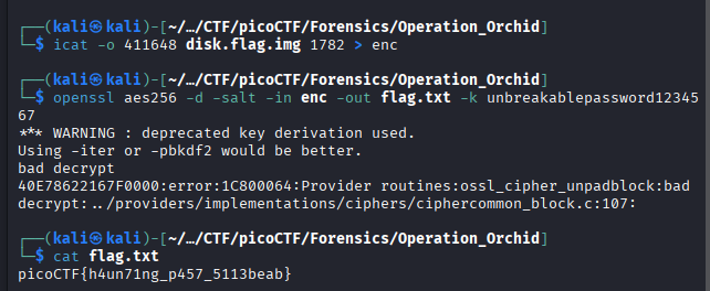 icat -o 411648 disk.flag.img 1782 > enc to get the encrypted file out, and: