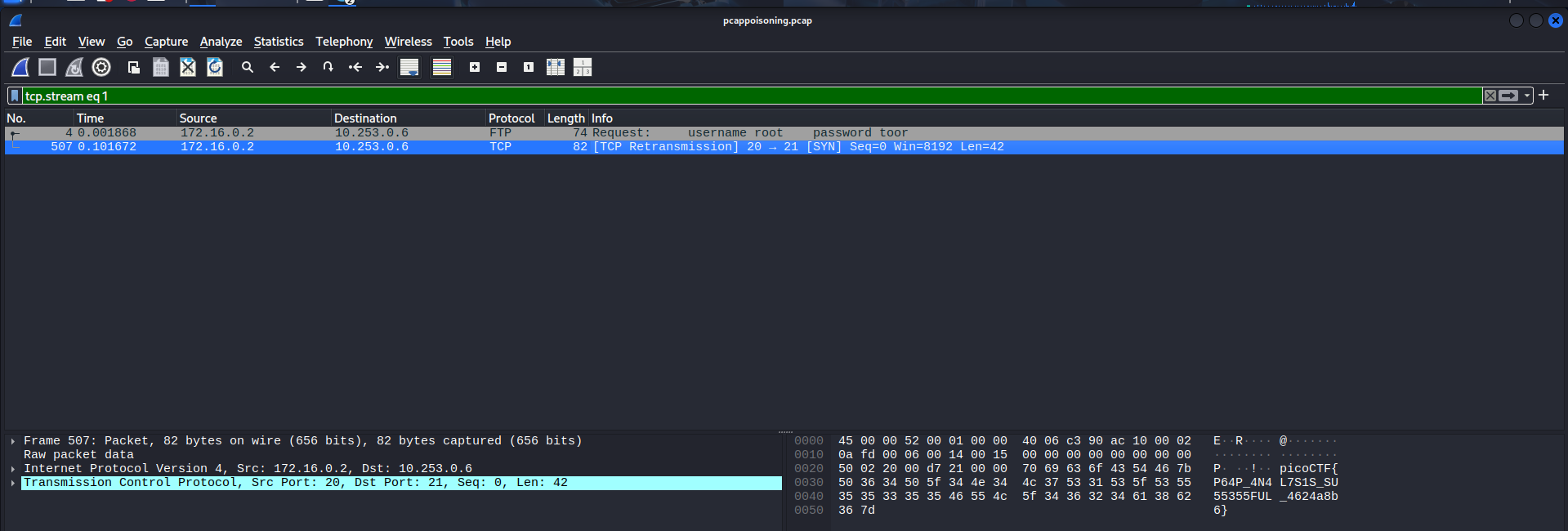 Follow the packet via Follow->TCP stream, the filter is changed to tcp.stream eq 1, and we can see there’s a TCP packet that appears: