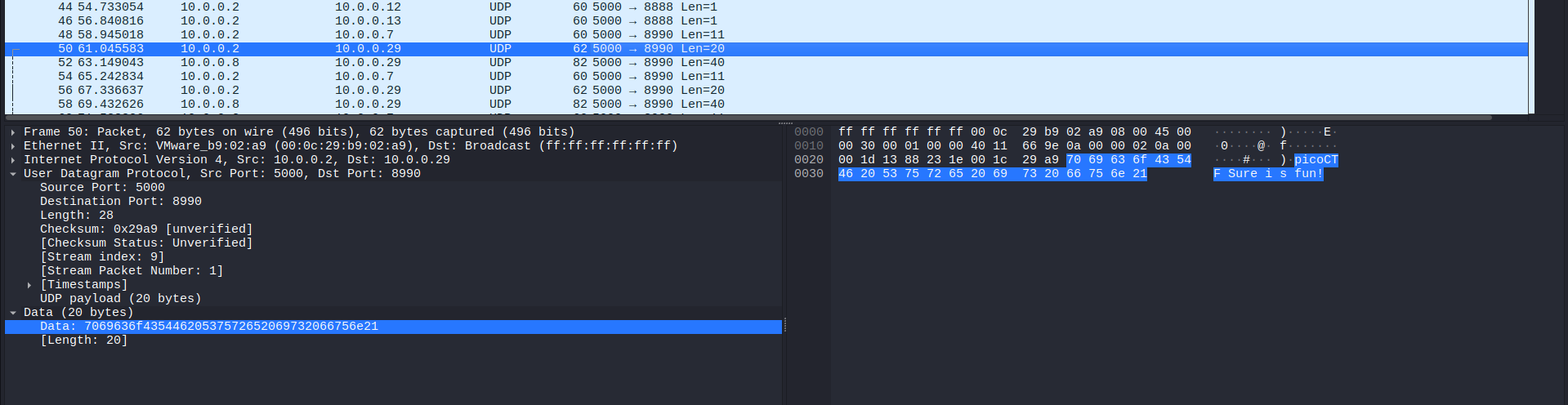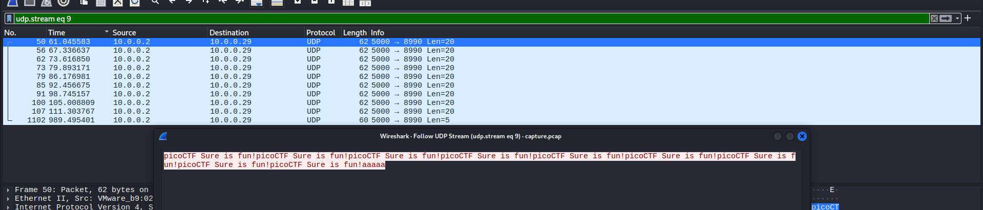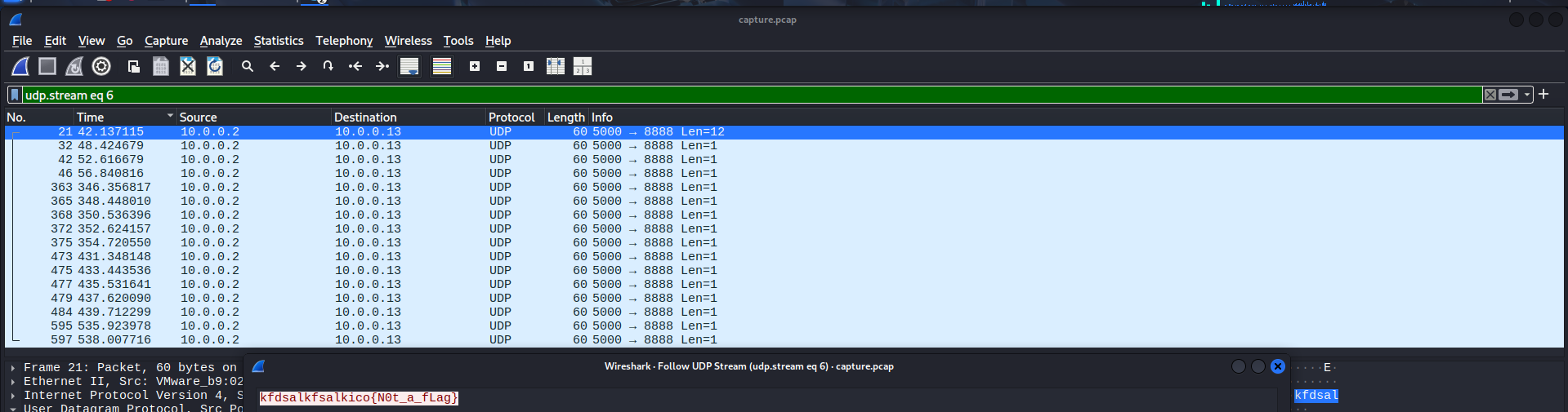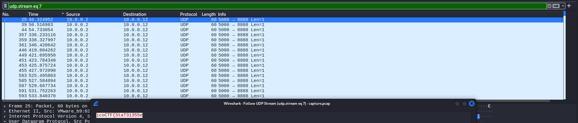 Checking some of the first packets, I noticed a part of the flag was in these UDP packets, just like the previous challenge: