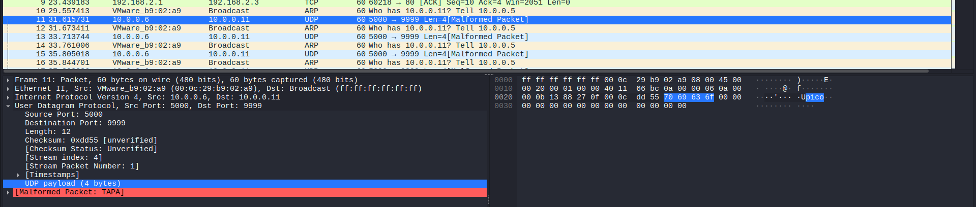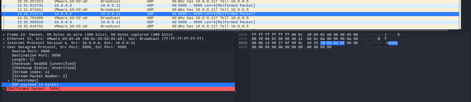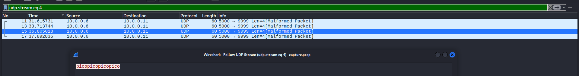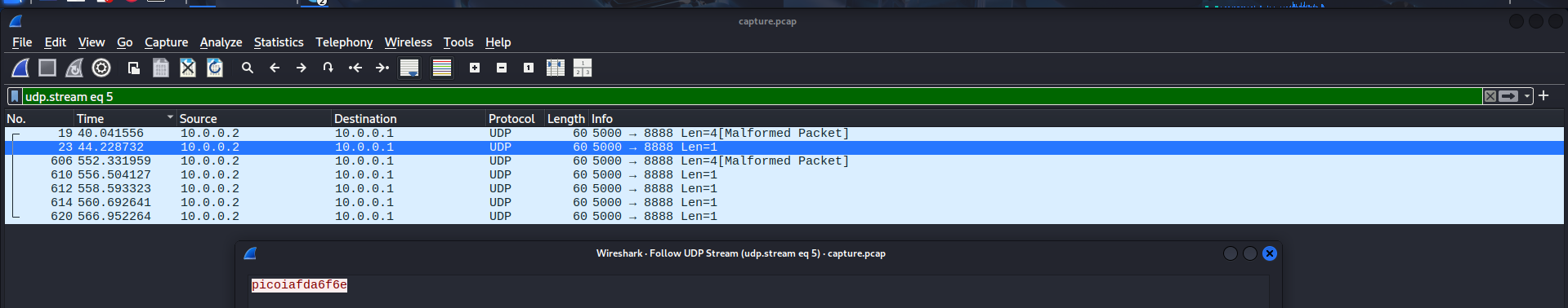 Checking some of the first packets, I noticed a part of the flag was in these UDP packets, just like the previous challenge: