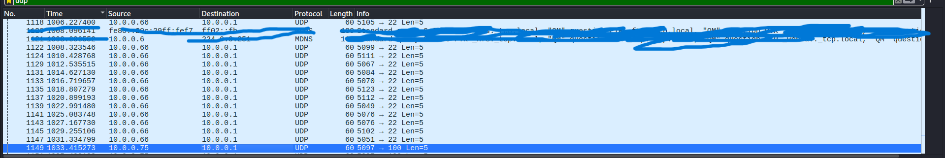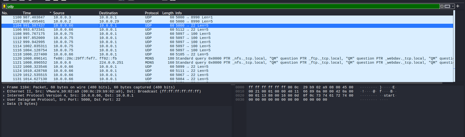 I also noticed that the source 10.0.0.66 sent data to the same destination 10.0.0.1, but the source port changed frequently:
