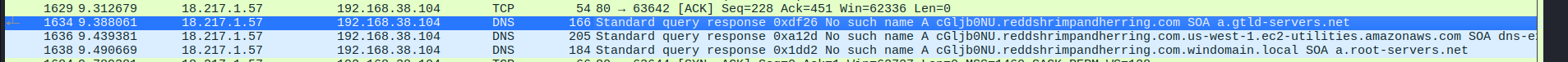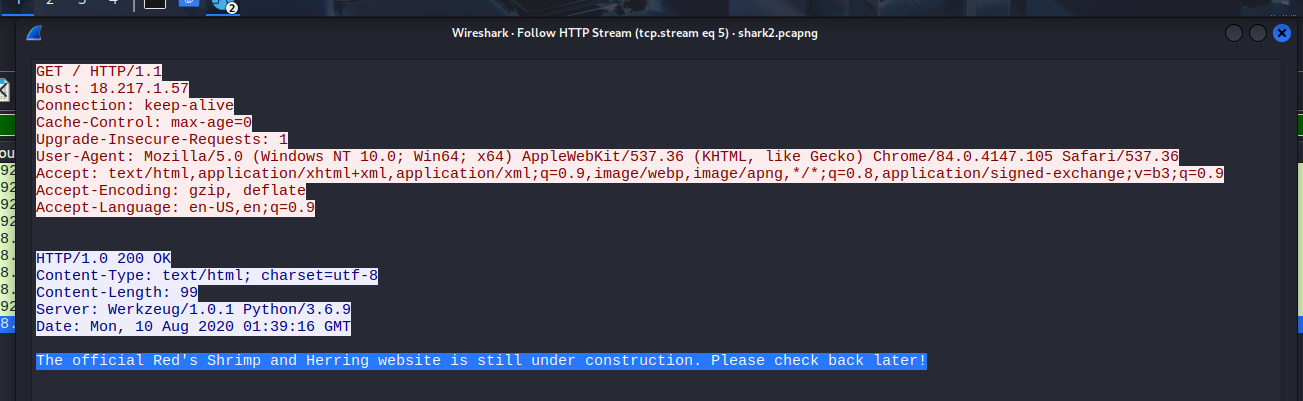 For that reason and from the analysis that I made, I decided to specifically analyze packets sent from 18.217.1.57. The “Red’s Shrimp and Herring” website seemed to be the most outstanding hint out there.