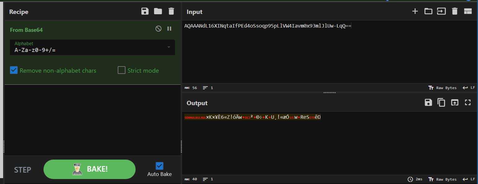 After following the packet, I copied the code and pasted it on CyberChef’s Base64 decoder. Unfortunately, the result was a garbage text: