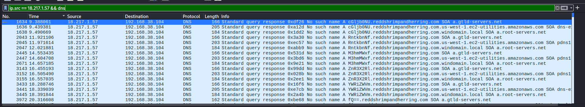 It was “picoCT” in “picoCTF”! I assumed that in the upcoming DNS packets, the Base64 flag parts were hidden there as well. I added one more filter in the filter box to show only DNS from 18.217.1.57:
