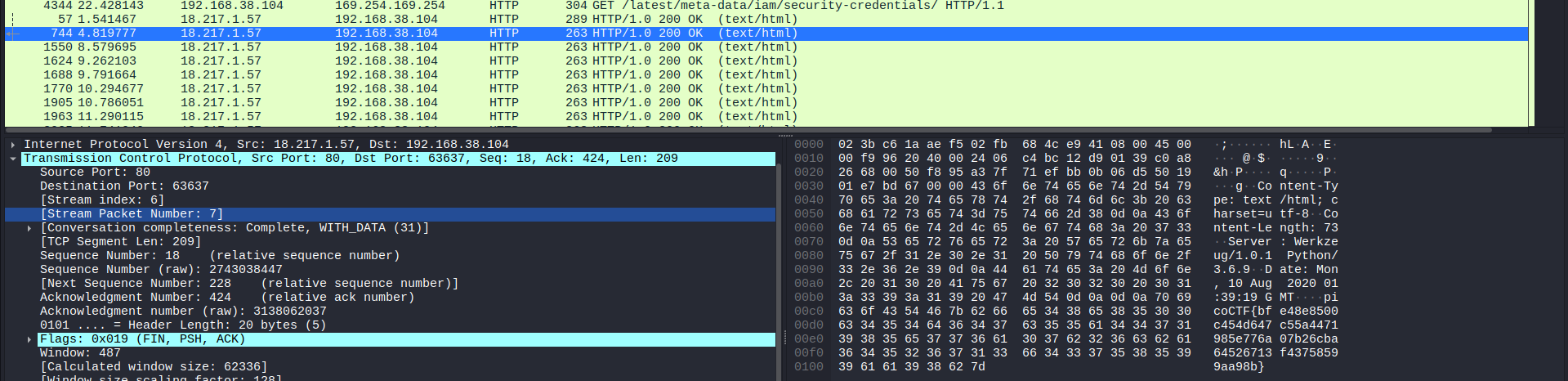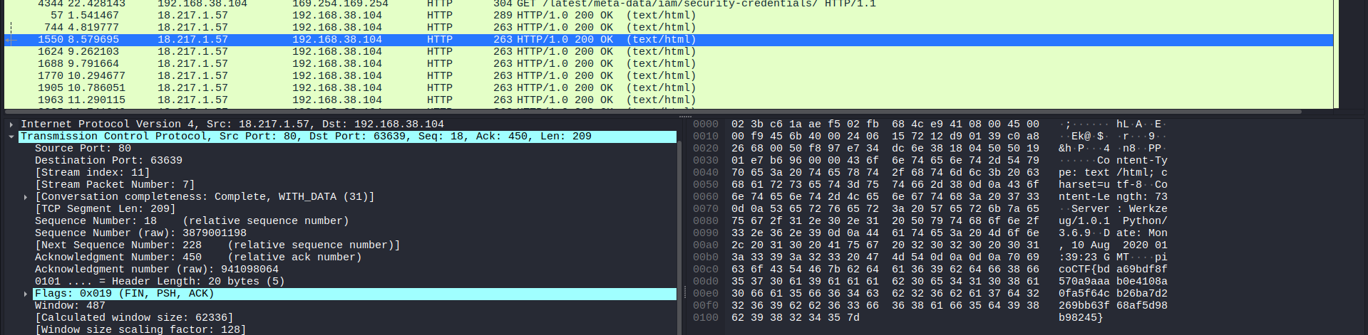 There were so many GET packets. The source was 192.168.38.104, and the destination was 18.217.1.57. The source was requesting the file flag a lot of times.